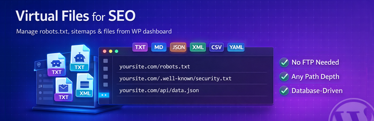 Virtual Files lets you create and manage robots.txt, XML sitemaps, ads.txt, security.txt, RSS feeds, and JSON files directly from your WordPress dashboard. These files can be created at any path depth (yoursite.com/robots.txt, yoursite.com/.well-known/security.txt, yoursite.com/api/data.json) and behave just like physical files, but are stored in your database—no FTP access required.